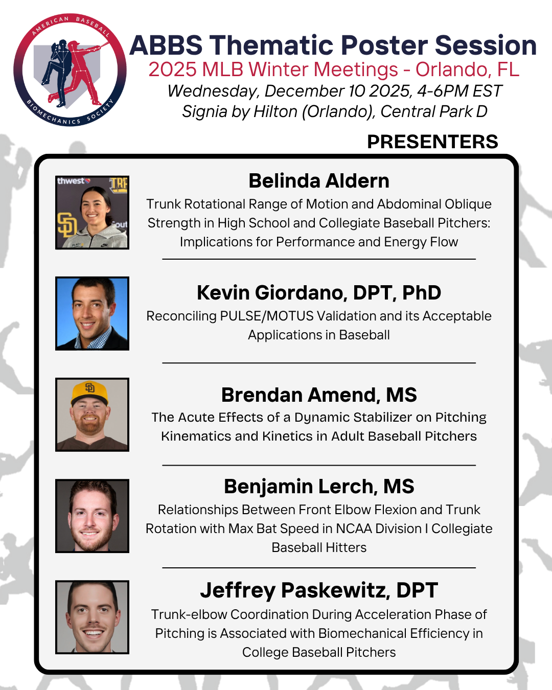 Join us for the annual ABBS Thematic Poster Session at this year’s MLB Winter Meetings in Orlando, FL on Wednesday, December 10, 2025. If you are unable to attend in-person,